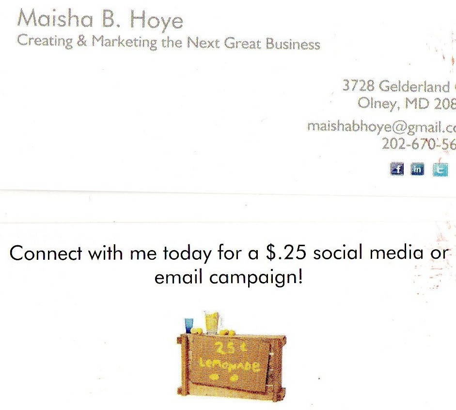 Business Card –  No need for a logo unless you fancy yourself a graphic designer.  Name, telephone and a heading that indicates the idea and you’re good. I used a Vistaprint special for my first card. You’ll start to see the ads everywhere! (Don’t laugh at my card, I know you can hardly see the yellow but it looked good when I previewed. Bad marketing person, Bad!)